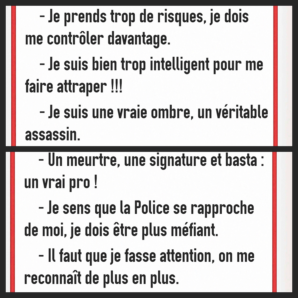 « Et la victime vit son bourreau dans les grandes lignes : il ne devait pas avoir plus de vingt-cinq ans. Grand, mince, habillé d’une salopette blanche, d’un t-shirt rouge et d’un béret bleu. Il regardait sa victime comme un chien regarderait l’os qu’on s’apprête à lui lancer. Prêt à bondir, prêt à goûter à son délicieux repas. On aurait dit un homme déguisé pour l’occasion tellement ses habits sortaient du lot. Bleu, blanc et rouge. Sur le coup, la victime ne remarqua même pas cette similitude avec le drapeau du pays d’origine de Frenchy. Peut-être, la connaissance de son nom l’aurait aidé à constater ce détail, mais remarquer ce genre de chose n’était pas dans la liste de ses préoccupations. »