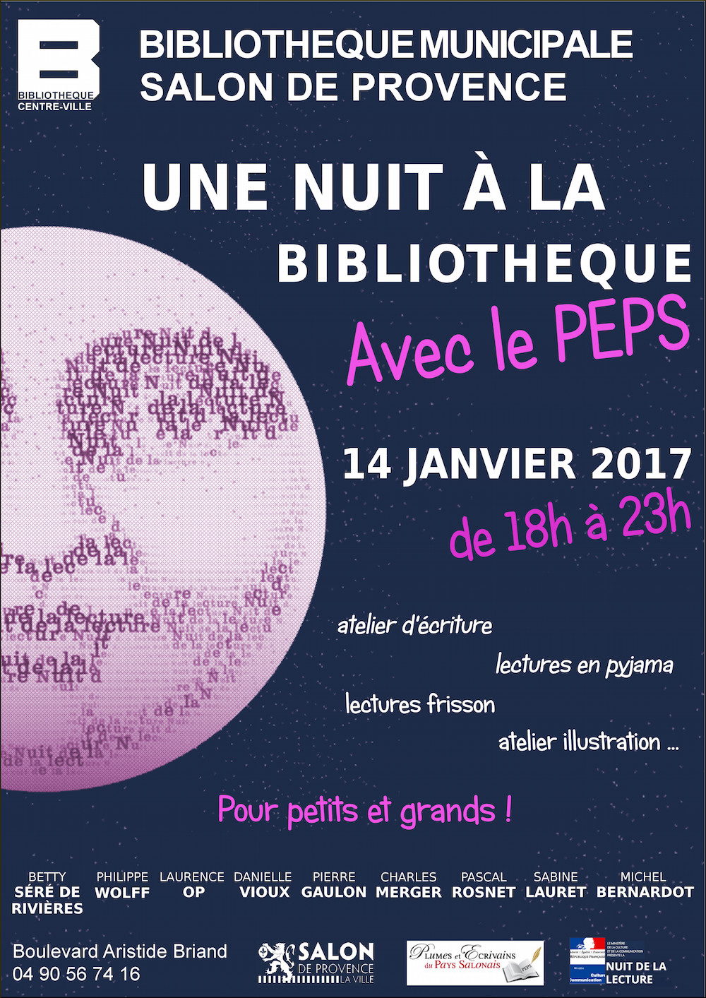 Pour cette première édition, avec mes amis les Plumes et Ecrivains du Pays Salonais, nous serons à la Bibliothèque Municipale de Salon de Provence. Au programme : lectures, jeu, rencontres, ateliers, …