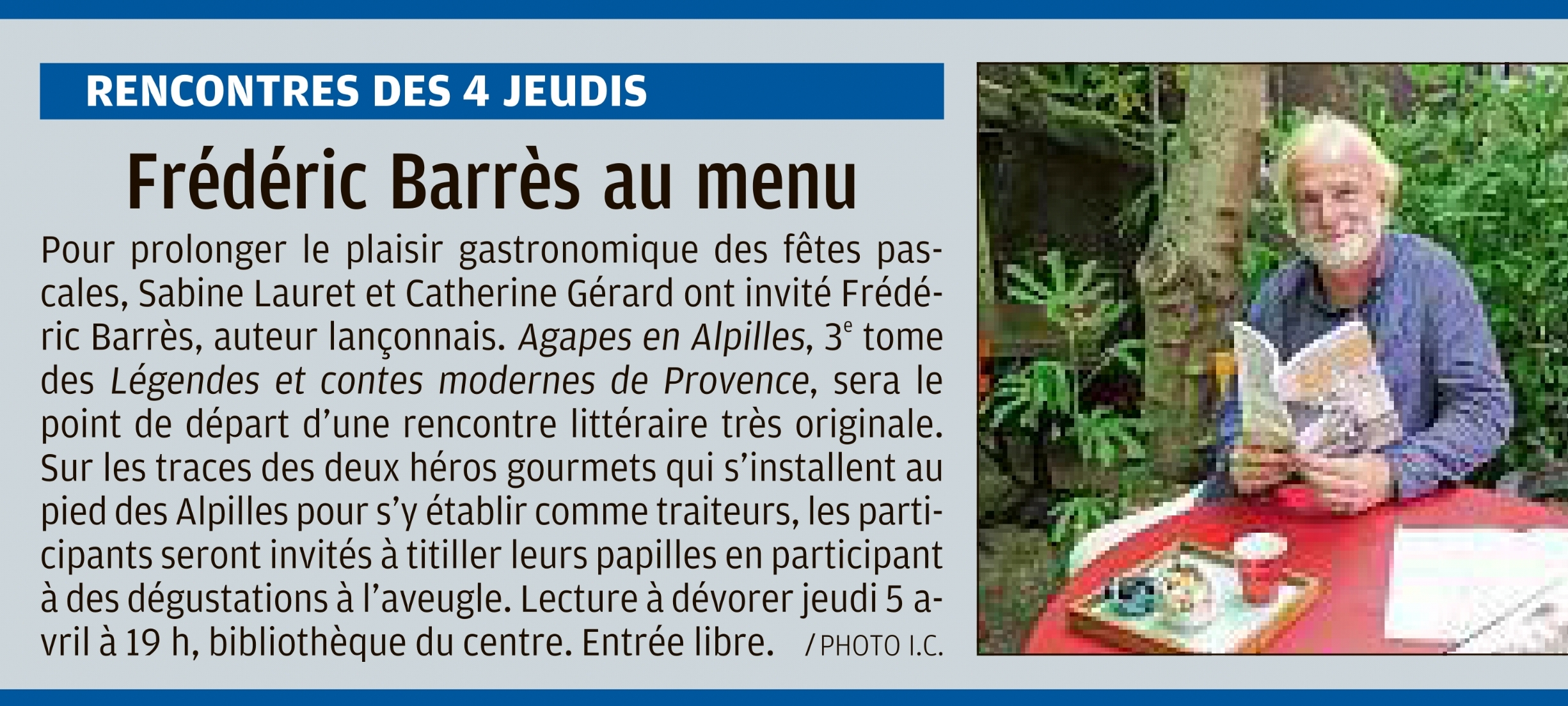 Le quotidien La Provence annonce la rencontre avec Frédéric Barrès, jeudi à la bibliothèque de Salon de Provence.