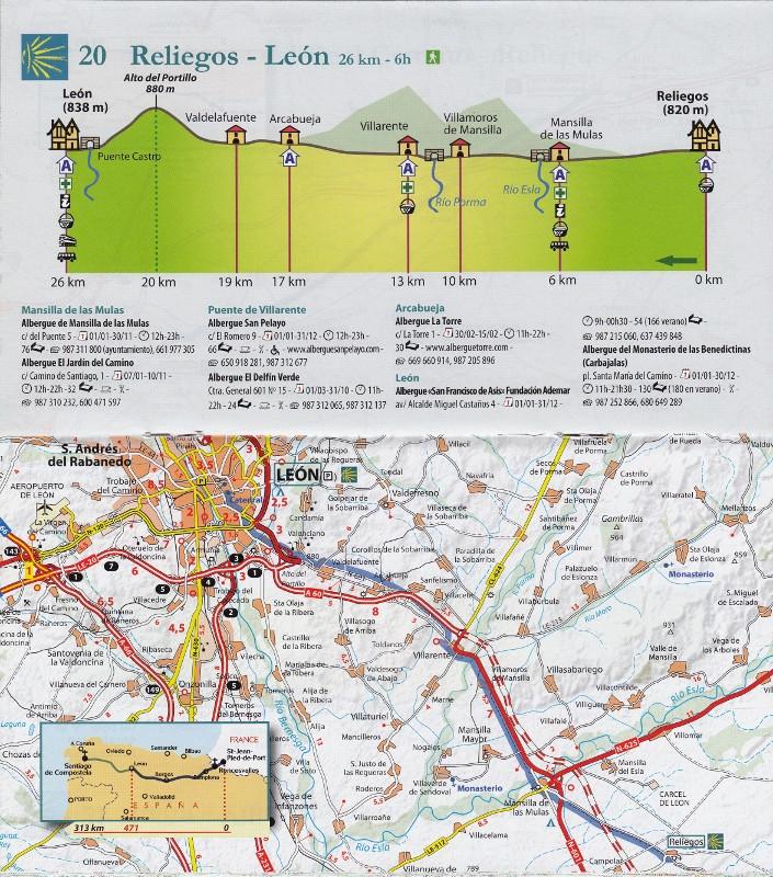 - en bas, une carte routière, vue générale qui récapitule la distance parcourue depuis Saint-Jean-Pied-de-Port et celle qui reste pour atteindre Saint-Jacques de Compostelle.