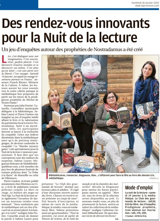 Le quotidien La Provence annonce le programme de la médiathèque de Salon pour cette 3ème édition de La Nuit de la Lecture.