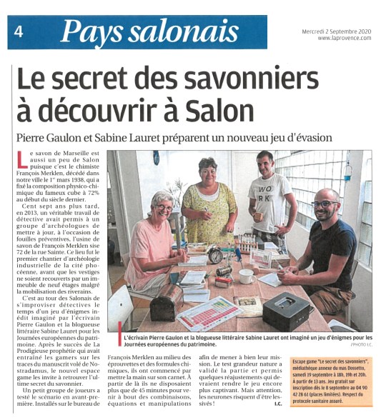 Le quotidien La Provence annonce Le Secret des Savonnier, un nouveau jeu d’enquête à découvrir lors des Journées Européennes du Patrimoine.