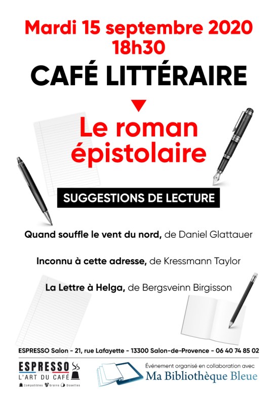 Pour notre prochain rendez-vous chez Espresso Salon de Provence, je vous propose un café littéraire sur le thème du roman épistolaire.