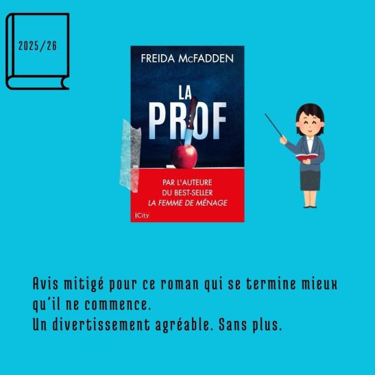Côté divertissement, j’ai lu La prof, de Freida McFadden. Avis mitigé …