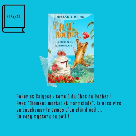 Côté divertissement, j’ai lu le 6ème tome du cosy mystery Le Chat Du Rocher : Diamant mortel et marmelade. Une fois de plus, le duo Nelson & Quinn signe une enquête au poil !