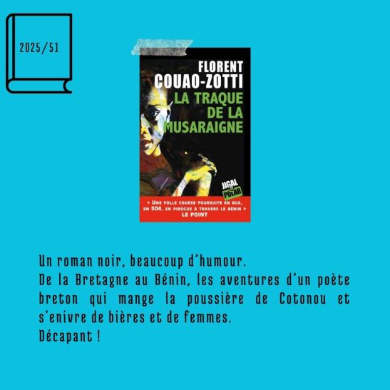 Enfin, j’ai épluché le guide Petit futé du Bénin, afin de préparer mon prochain voyage et j’ai dévoré La traque de la musaraigne, de Florent Couao-Zotti, pour me mettre dans l’ambiance de Cotonou.