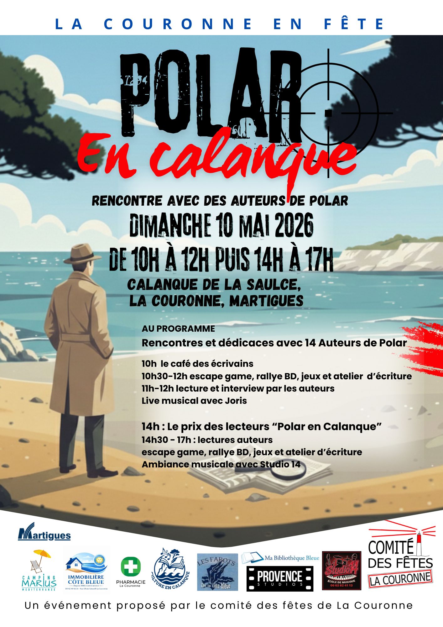 Je suis très heureuse de participer à la seconde édition de POLAR EN CALANQUE. Cet événement se déroulera le dimanche 10 mai 2026 de 10h à 17h, sur l’ancien parking de la plage de La Saulce à La Couronne (13).